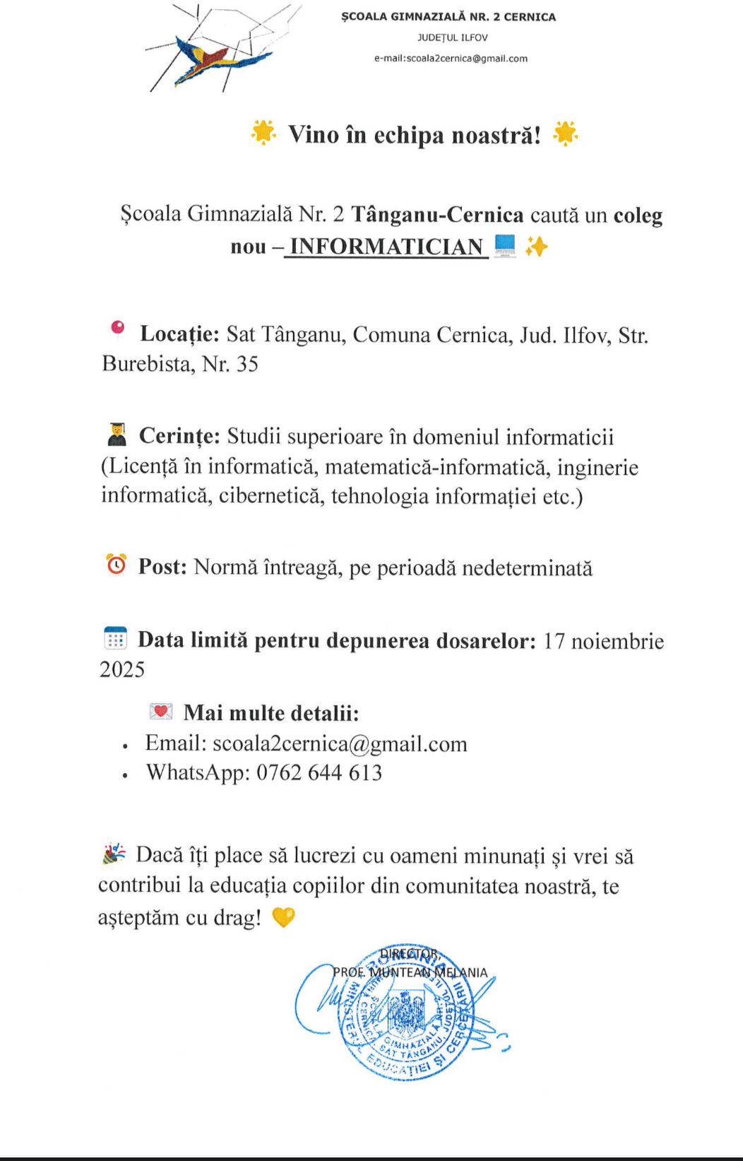 Școala Gimnazială Nr.3 Bălăceanca-Cernica, în asociere cu Școala Gimnazială Nr. 1 Cernica, organizează concurs pentru ocuparea postului contractual de INFORMATICIAN - 1 post (0,5 normă Școala Gimnazială Nr.3 Bălăceanca-Cernica + 0,5 normă Școala Gimnazială Nr. 1 Cernica), perioadă nedeterminată, conform H.G. nr. 286/2011, modificată şi completată de H.G. nr. 1027/2014.